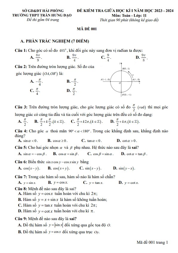 Sytu xin gửi đến quý thầy, cô giáo và các em học sinh lớp 11 đề kiểm tra giữa học kỳ 1 môn Toán lớp 11 năm học 2023 – 2024 trường THPT Trần Hưng Đạo, thành phố Hải Phòng. Đề thi bao gồm các câu hỏi trắc nghiệm và tự luận, kèm theo đáp án và hướng dẫn chấm điểm.