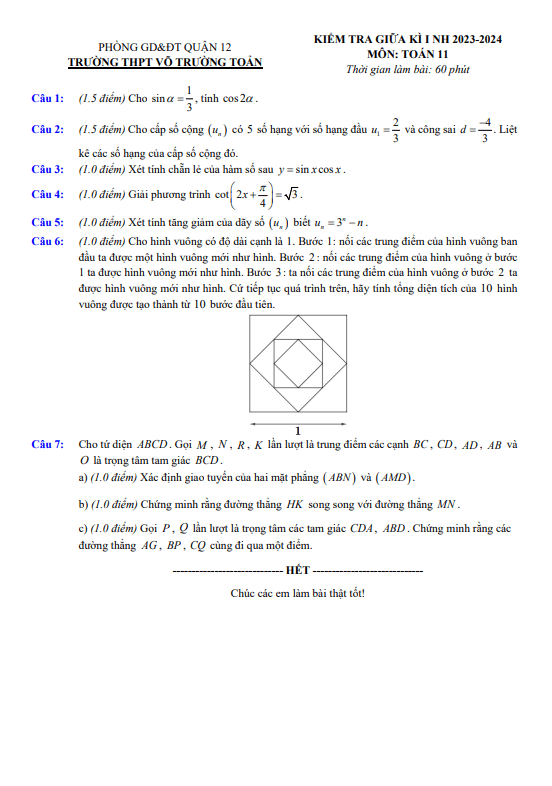 Đề thi Toán lớp 11 giữa học kì 1 năm 2023 – 2024 Trường THPT Võ Trường Toản TP HCM