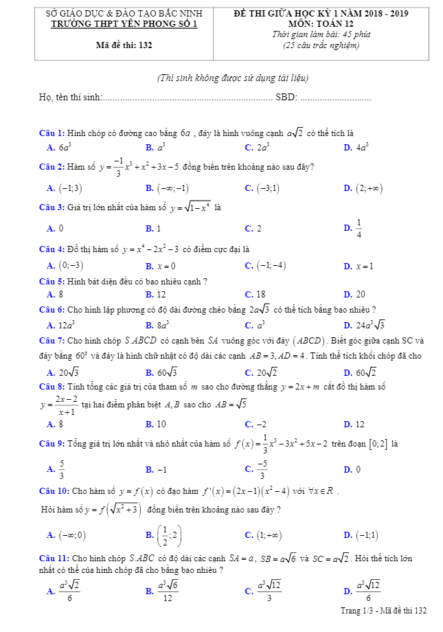 Sytu xin gửi đến quý thầy cô và các em học sinh khối 12 thông tin về đề thi giữa học kỳ 1 môn Toán của trường Yên Phong 1 Bắc Ninh năm học 2018-2019. Đề thi này được thiết kế nhằm kiểm tra chất lượng học tập của học sinh, với điểm hệ số 2 được sử dụng để đánh giá và xếp hạng học lực. Đề thi cũng đóng vai trò quan trọng trong việc tuyển chọn các em học sinh xuất sắc để bổ sung vào đội ngũ học sinh giỏi Toán lớp 12 của trường.Đề thi có mã đề 132, bao gồm 3 trang với 25 câu hỏi và bài toán trắc nghiệm. Thời gian làm bài là 45 phút. Các câu hỏi trong đề thi được lựa chọn từ nội dung đã được học trong chương trình Toán lớp 12. Đề thi đi kèm với đáp án các mã đề 132, 209, 357, 485.Một số câu hỏi mẫu trong đề thi bao gồm:1. Điều nào sau đây là đúng khi nói về đồ thị hàm số bậc ba?A. Đồ thị luôn có điểm cực trị.B. Đồ thị luôn cắt trục hoành.C. Đồ thị nhận trục tung làm tiệm cận đứng.D. Đồ thị luôn tiếp xúc với trục hoành.2. Cho hình chóp S.ABCD, biết các thông tin về góc giữa cạnh SC và đáy, cạnh bên SA vuông góc với đáy là hình chữ nhật. Tính thể tích khối chóp đã cho.3. Công thức tính thể tích khối lăng trụ với chiều cao h và diện tích đáy sd là gì?Đề thi giữa học kỳ 1 Toán lớp 12 năm 2018-2019 của trường Yên Phong 1 Bắc Ninh đánh giá năng lực và kiến thức của học sinh, cũng như giúp tạo điều kiện cho việc tuyển chọn học sinh giỏi. Hy vọng rằng các em sẽ tự tin và thành công trong kỳ thi này. Chúc các em học tốt và đạt kết quả cao!