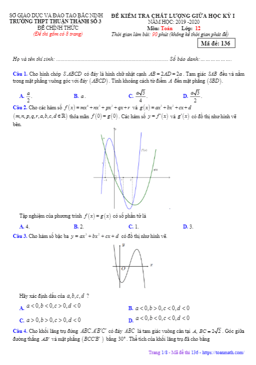 Chiều thứ Sáu ngày 08 tháng 12 năm 2019, trường THPT Thuận Thành số 3, tỉnh Bắc Ninh đã tổ chức kiểm tra chất lượng giữa học kỳ 1 môn Toán lớp 12 trong năm học 2019-2020. Đề thi có mã số 136 được biên soạn dưới dạng đề trắc nghiệm khách quan, gồm 50 câu hỏi và bài toán trải dài trên 08 trang, thời gian làm bài là 90 phút.
