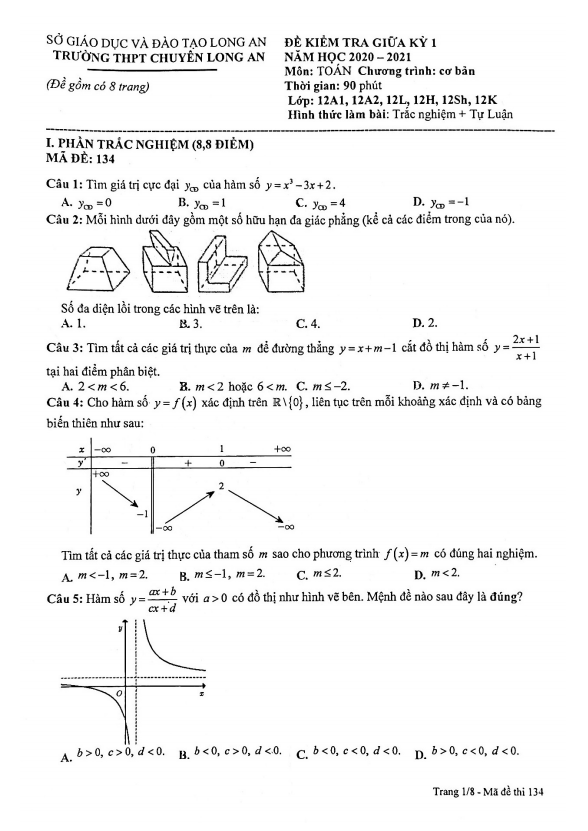 Đề thi giữa kỳ 1 Toán lớp 12 năm 2020 – 2021 trường THPT chuyên Long An là bài kiểm tra dành cho học sinh các lớp theo học chương trình Toán lớp 12 cơ bản như 12A1, 12A2, 12L, 12H, 12Sh và 12K. Đề bao gồm 44 câu trắc nghiệm và 02 câu tự luận, thời gian làm bài thi là 90 phút.