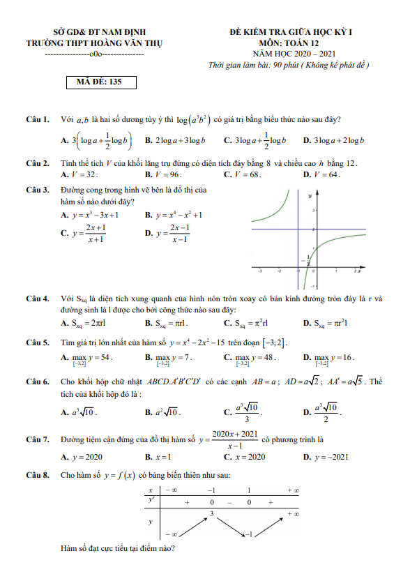 Đề thi giữa học kì 1 (HK1) lớp 12 môn Toán năm 2020 2021 trường THPT Hoàng Văn Thụ Nam Định