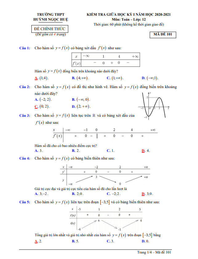 Sytu xin giới thiệu đến quý thầy cô và các em học sinh khối 12 đề thi giữa học kì 1 môn Toán năm học 2020 – 2021 của trường THPT Huỳnh Ngọc Huệ Quảng Nam. Đề thi bao gồm 32 câu hỏi và bài toán dạng trắc nghiệm trên 05 trang, thời gian làm bài 60 phút và có đáp án đi kèm.