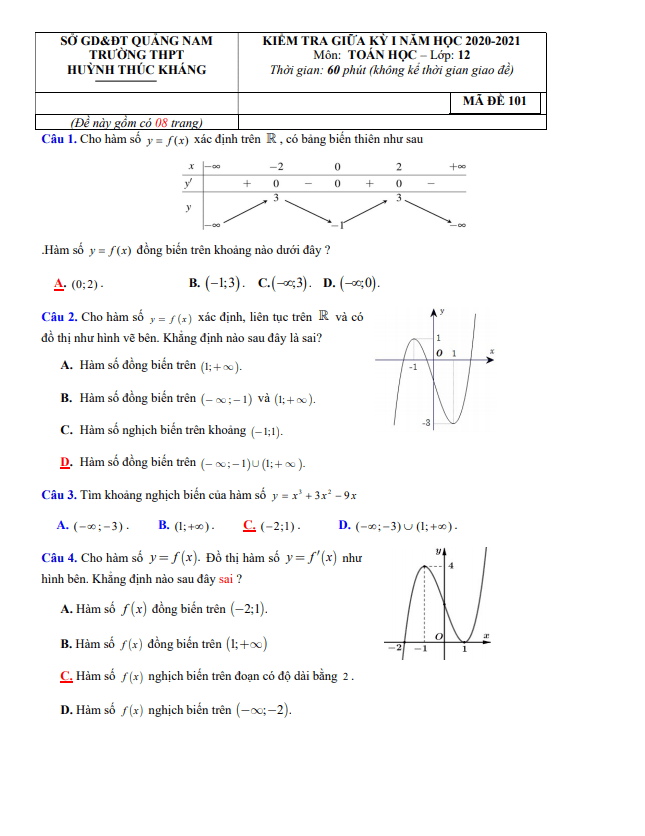 Trích dẫn đề thi giữa HK1 Toán lớp 12 năm 2020 – 2021 trường THPT Huỳnh Thúc Kháng – Quảng Nam: