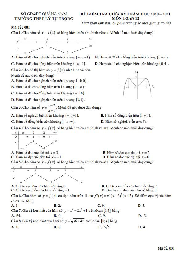 Đề thi giữa học kì 1 Toán lớp 12 năm 2020 – 2021 trường THPT Lý Tự Trọng Quảng Nam gồm 32 câu hỏi và bài toán dạng trắc nghiệm được chia thành 4 trang. Thời gian làm bài thi là 60 phút. Đề thi bao gồm đáp án mã đề từ 001 đến 008.