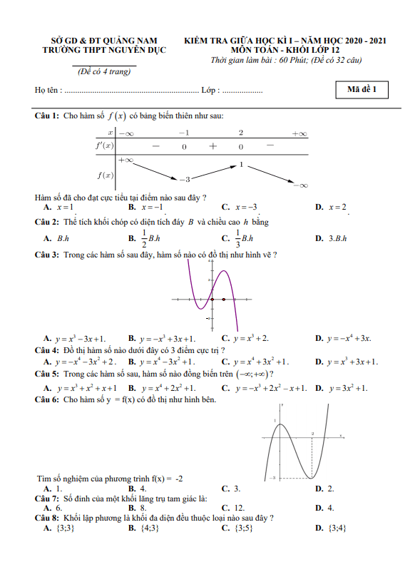 Đề thi giữa học kì 1 (HK1) lớp 12 môn Toán năm 2020 2021 trường THPT Nguyễn Dục Quảng Nam