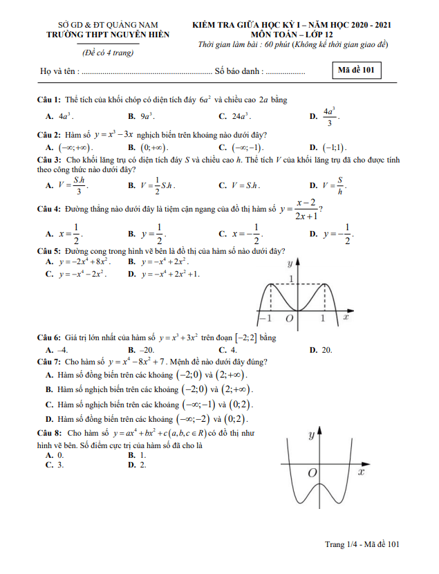 Đề thi giữa học kì 1 (HK1) lớp 12 môn Toán năm 2020 2021 trường THPT Nguyễn Hiền Quảng Nam