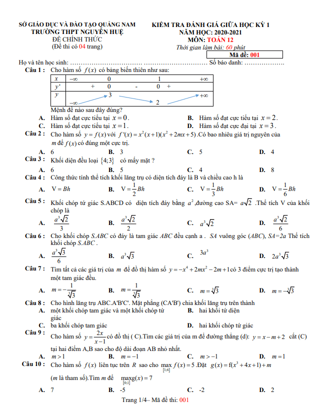 Xin chào quý thầy, cô giáo và các em học sinh khối 12! Đây là đề thi giữa học kì 1 môn Toán lớp 12 năm học 2020 – 2021 của trường THPT Nguyễn Huệ Quảng Nam. Đề thi bao gồm 32 câu hỏi và bài toán dạng trắc nghiệm trên 04 trang, thời gian làm bài 60 phút và đề thi được đính kèm đáp án.