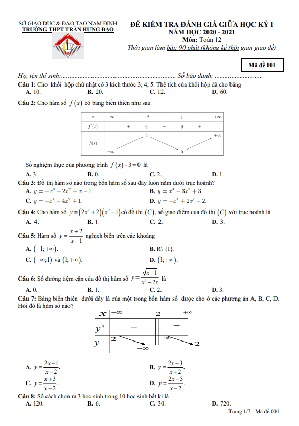 Vào ngày … tháng 11 năm 2020, trường THPT Trần Hưng Đạo, tỉnh Nam Định đã tổ chức kỳ thi kiểm tra đánh giá giữa học kỳ 1 môn Toán cho học sinh lớp 12 năm học 2020-2021. Đề thi mã đề 001 gồm 07 trang với 50 câu hỏi và bài toán dạng trắc nghiệm, thời gian làm bài thi là 90 phút.