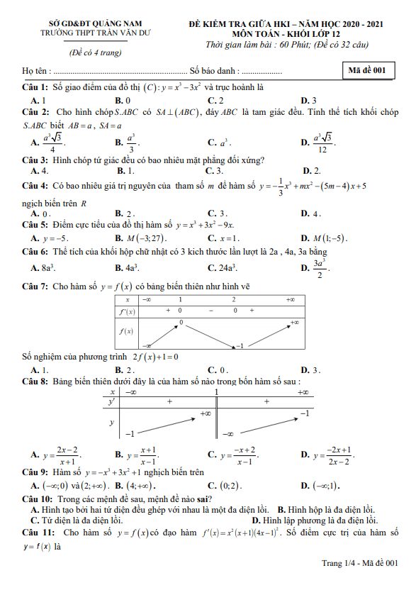 Đề thi giữa học kì 1 (HK1) môn Toán lớp 12 năm học 2020 – 2021 tại trường THPT Trần Văn Dư – Quảng Nam đã được Sytu giới thiệu đến quý thầy cô và các em học sinh khối 12. Đề thi bao gồm 32 câu hỏi và bài toán dạng trắc nghiệm trải qua 4 trang, học sinh sẽ có thời gian làm bài trong 60 phút và đề thi đi kèm đáp án để học sinh tự kiểm tra kết quả.Một số câu hỏi và bài toán trong đề thi như sau:1. Cho hình chóp tứ giác đều S.ABCD có cạnh đáy bằng 2a, góc giữa hai mặt phẳng (SAB) và (ABCD) bằng 45°. M, N và P lần lượt là trung điểm các cạnh SA, SB và AB. Hãy tính thể tích V của khối tứ diện DMNP.2. Cho tứ diện S.ABC, M và N là các điểm thuộc các cạnh SA và SB sao cho MA = 2SM, SN = 2NB, (α) là mặt phẳng qua MN và song song với SC. Kí hiệu (H1) và (H2) là các khối đa diện có được khi chia khối tứ diện S.ABC bởi mặt phẳng (α), trong đó (H1) chứa điểm S, (H2) chứa điểm A; V1 và V2 lần lượt là thể tích của (H1) và (H2). Hãy tính tỉ số V1/V2.3. Trong các mệnh đề sau, mệnh đề nào sai? A. Hình tạo bởi hai tứ diện đều ghép với nhau là một đa diện lồi. B. Hình hộp là đa diện lồi. C. Tứ diện là đa diện lồi. D. Hình lập phương là đa diện lồi.Qua đó, đề thi giữa HK1 môn Toán lớp 12 năm học 2020 – 2021 tại trường THPT Trần Văn Dư – Quảng Nam đã được biên soạn cẩn thận để giúp học sinh rèn luyện kiến thức và kỹ năng trong môn học này. Mong rằng các em học sinh sẽ tự tin và thành công khi tham gia bài kiểm tra này.