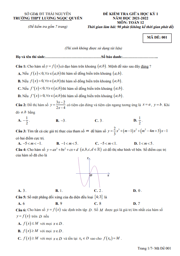 Đề thi giữa kì 1 Toán lớp 12 năm 2021 – 2022 trường THPT Lương Ngọc Quyến – Thái Nguyên