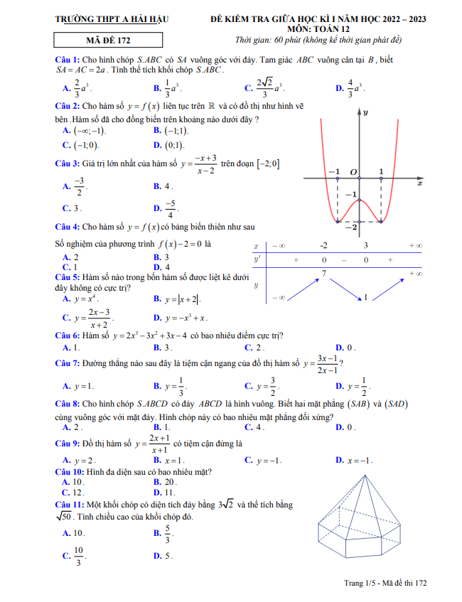 Chúng ta sẽ cùng tìm hiểu về đề thi chất lượng giữa học kì 1 môn Toán lớp 12 năm học 2022-2023 tại trường THPT A Hải Hậu, tỉnh Nam Định (mã đề 172).