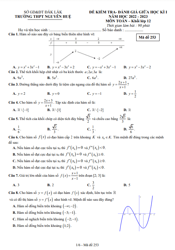 Đề thi giữa học kì 1 (HK1) lớp 12 môn Toán năm 2022-2023 trường THPT Nguyễn Huệ Đắk Lắk