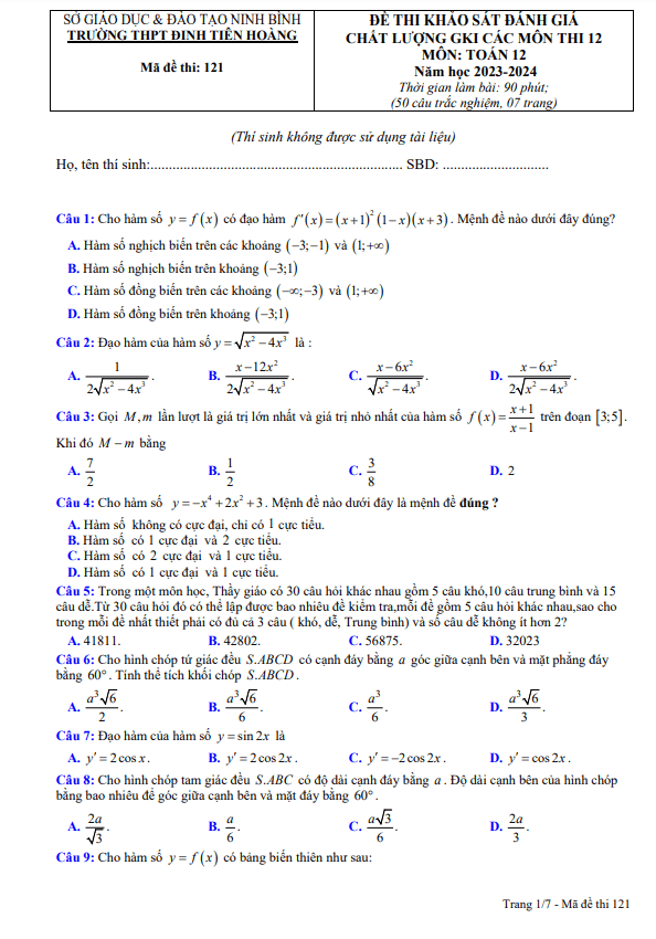 Sytu xin gửi đến quý thầy, cô và các em học sinh lớp 12 đề thi khảo sát đánh giá chất lượng giữa học kì 1 môn Toán lớp 12 năm học 2023 – 2024 trường THPT Đinh Tiên Hoàng, tỉnh Ninh Bình. Đề thi có mã đề 121, được thi bằng hình thức trắc nghiệm với 50 câu hỏi và bài toán, thời gian làm bài 90 phút.