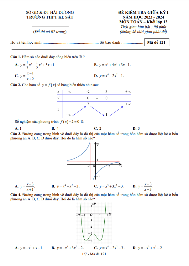 Sytu xin gửi đến quý thầy cô và các em học sinh lớp 12 đề kiểm tra giữa học kỳ 1 môn Toán lớp 12 năm học 2023 – 2024 trường THPT Kẻ Sặt, tỉnh Hải Dương. Đề thi có đáp án trắc nghiệm mã đề 121.
