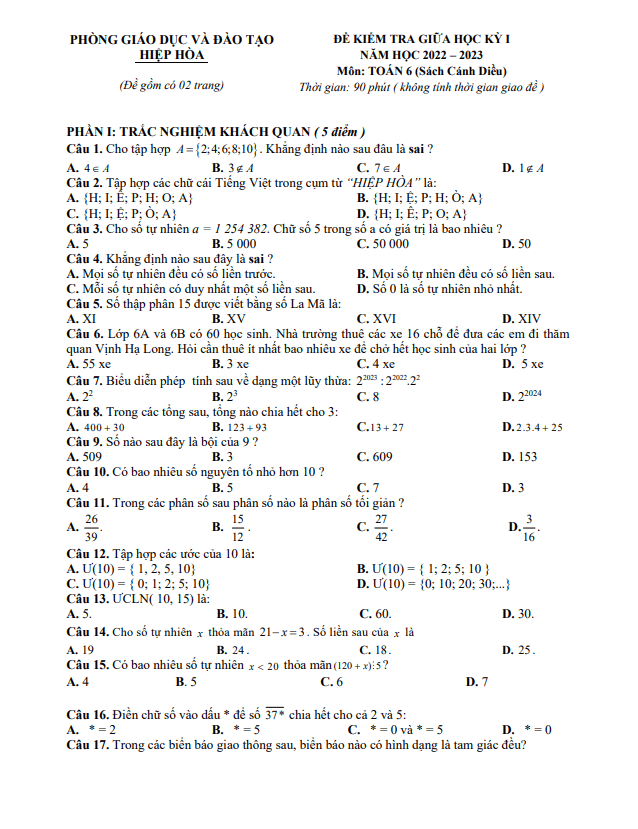 Đề thi giữa học kỳ 1 (HK1) môn Toán lớp 6 năm 2022-2023 của trường phòng Giáo dục và Đào tạo huyện Hiệp Hòa Bắc Giang đã được công bố. Đề thi được biên soạn theo cấu trúc 50% trắc nghiệm và 50% tự luận, thời gian làm bài 90 phút.Một số câu hỏi trong đề thi khá thú vị, như câu hỏi về cách chia học sinh nam và nữ trong lớp sao cho bằng nhau, hoặc câu hỏi về cần thuê ít nhất bao nhiêu xe để chở hết học sinh đi thăm quan Vịnh Hạ Long. Các câu hỏi đều kỳ thú và đòi hỏi học sinh phải suy luận logic để giải quyết.Nội dung của đề thi rất phong phú và đa dạng, giúp học sinh rèn luyện kỹ năng giải toán cũng như tư duy logic. Đồng thời, đề thi cũng có đáp án và lời giải chi tiết, giúp học sinh hiểu rõ cách giải và tự kiểm tra kết quả của mình.Đề thi giữa kỳ 1 Toán lớp 6 năm 2022-2023 này chắc chắn sẽ là một bước thách thức mà các em học sinh không nên bỏ lỡ. Chúc các em may mắn và thành công trong việc làm bài thi!