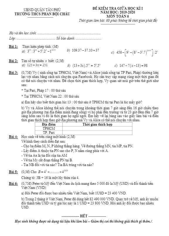 Đề thi giữa học kì 1 Toán lớp 6 năm 2019 – 2020 trường THCS Phan Bội Châu TP HCM