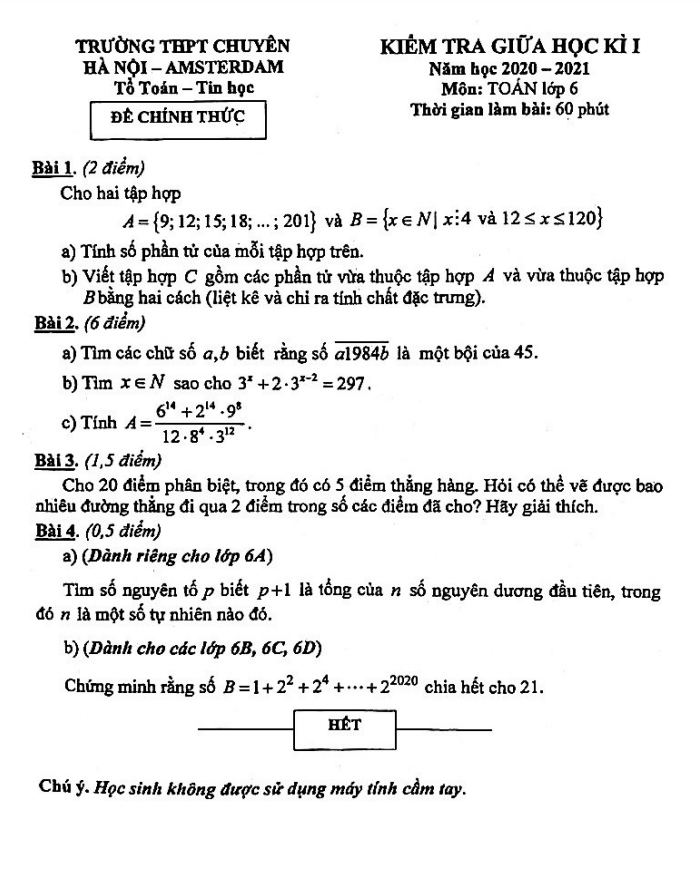 Sáng thứ Tư ngày 28 tháng 10 năm 2020, Tổ Toán – Tin trường THPT chuyên Hà Nội – Amsterdam tổ chức kỳ thi kiểm tra chất lượng giữa học kì 1 môn Toán lớp 6 năm học 2020 – 2021. Đề thi giữa HK1 Toán lớp 6 năm 2020 – 2021 trường chuyên Hà Nội – Amsterdam gồm 01 trang, đề được biên soạn theo dạng đề tự luận với 04 bài toán, thời gian học sinh làm bài thi là 60 phút.