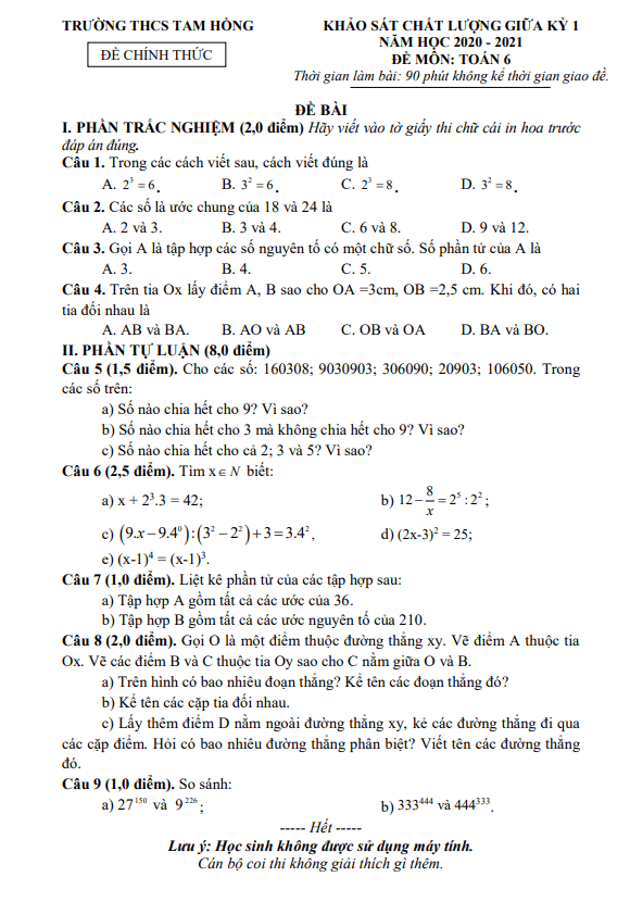 Đề thi giữa kỳ 1 Toán lớp 6 năm 2020 – 2021 trường THCS Tam Hồng – Vĩnh Phúc