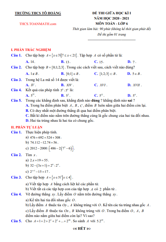 Xin chào quý thầy cô và các em học sinh lớp 6! Hôm nay, Sytu xin giới thiệu đến mọi người đề thi giữa học kì 1 môn Toán năm học 2020 – 2021 của trường THCS Tô Hoàng ở Hà Nội. Đề thi này bao gồm các câu hỏi thú vị và cung cấp đáp án cũng như lời giải chi tiết.