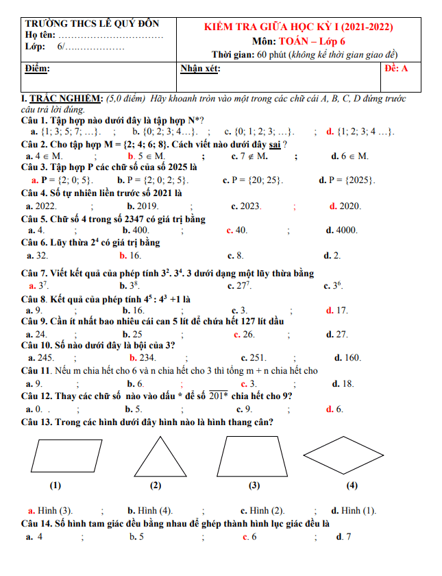 Trích dẫn đề giữa học kỳ 1 Toán lớp 6 năm 2021 – 2022 trường THCS Lê Quý Đôn – Quảng Nam: