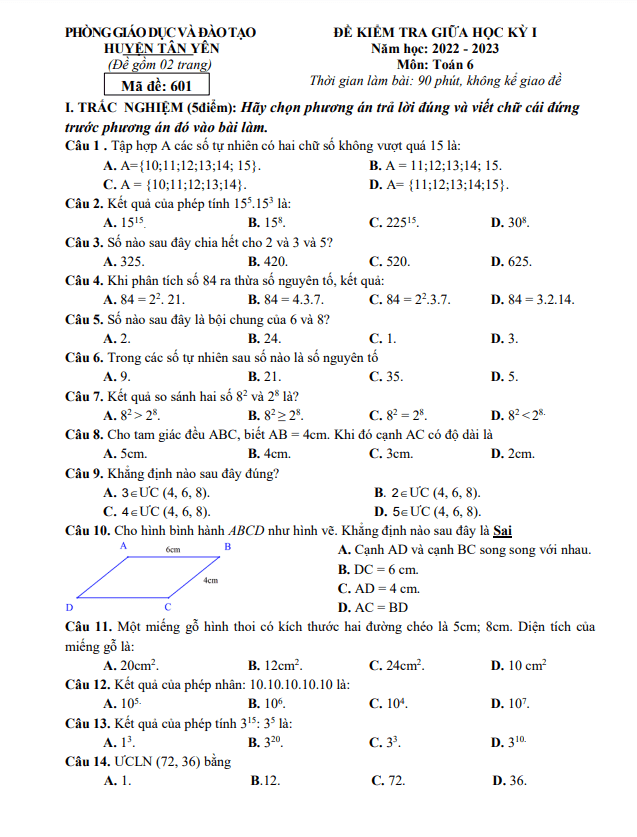 Đề thi giữa học kỳ 1 (HK1) lớp 6 môn Toán năm 2022-2023 phòng GD ĐT Tân Yên Bắc Giang