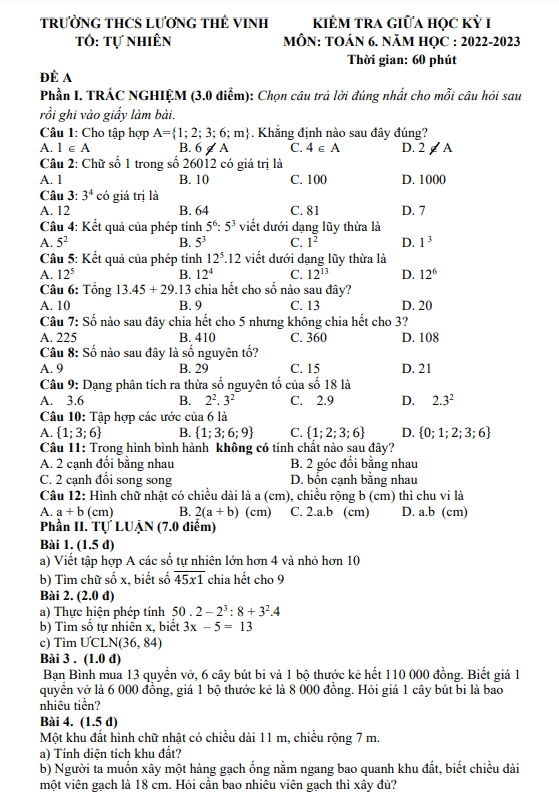Xin chào quý thầy cô và các em học sinh lớp 6! Hôm nay chúng ta sẽ cùng tìm hiểu về đề kiểm tra giữa học kỳ 1 môn Toán lớp 6 năm học 2022-2023 tại trường THCS Lương Thế Vinh, tỉnh Quảng Nam.