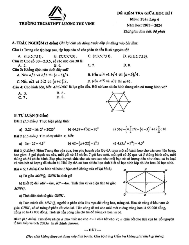 Đề thi giữa học kì 1 (HK1) lớp 6 môn Toán năm 2023-2024 trường Lương Thế Vinh Hà Nội