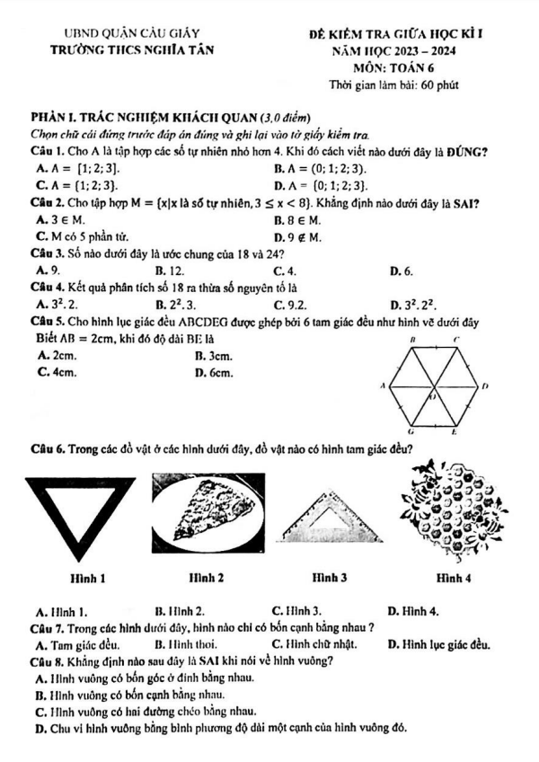 Đề thi giữa học kì 1 (HK1) lớp 6 môn Toán năm 2023 2024 trường THCS Nghĩa Tân Hà Nội