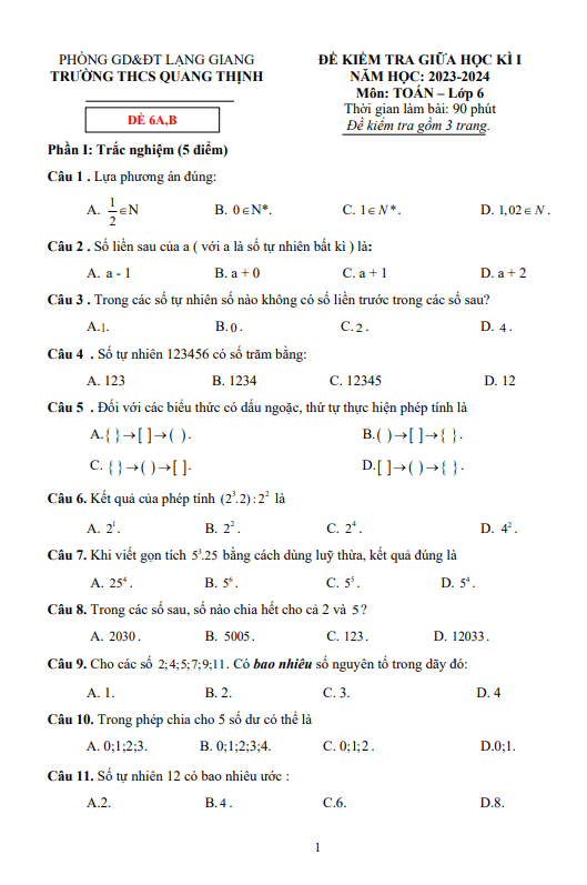 Đề thi giữa học kì 1 (HK1) lớp 6 môn Toán năm 2023 2024 trường THCS Quang Thịnh Bắc Giang
