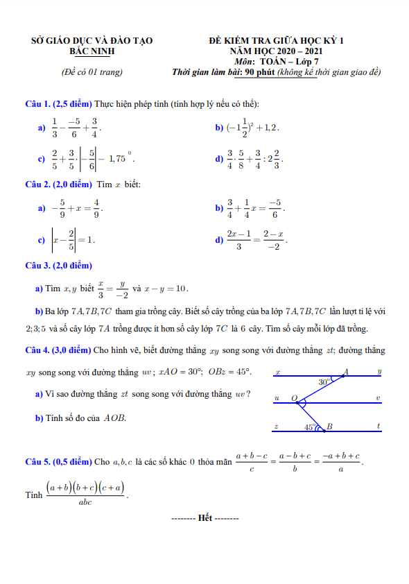 Đề thi giữa học kì 1 (HK1) lớp 7 môn Toán năm 2020 2021 sở GD ĐT Bắc Ninh