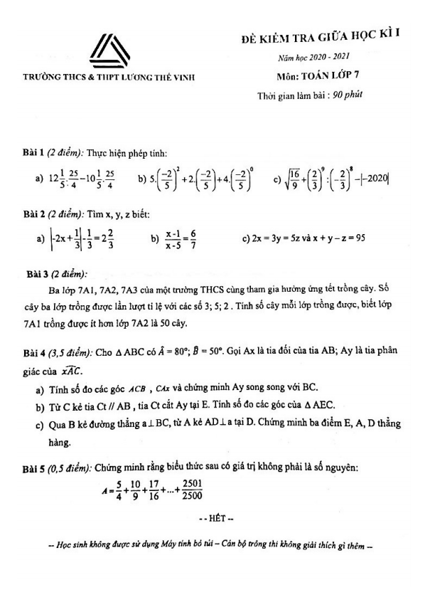 Đề thi giữa học kì 1 lớp 7 môn Toán năm 2020 2021 trường Lương Thế Vinh Hà Nội: