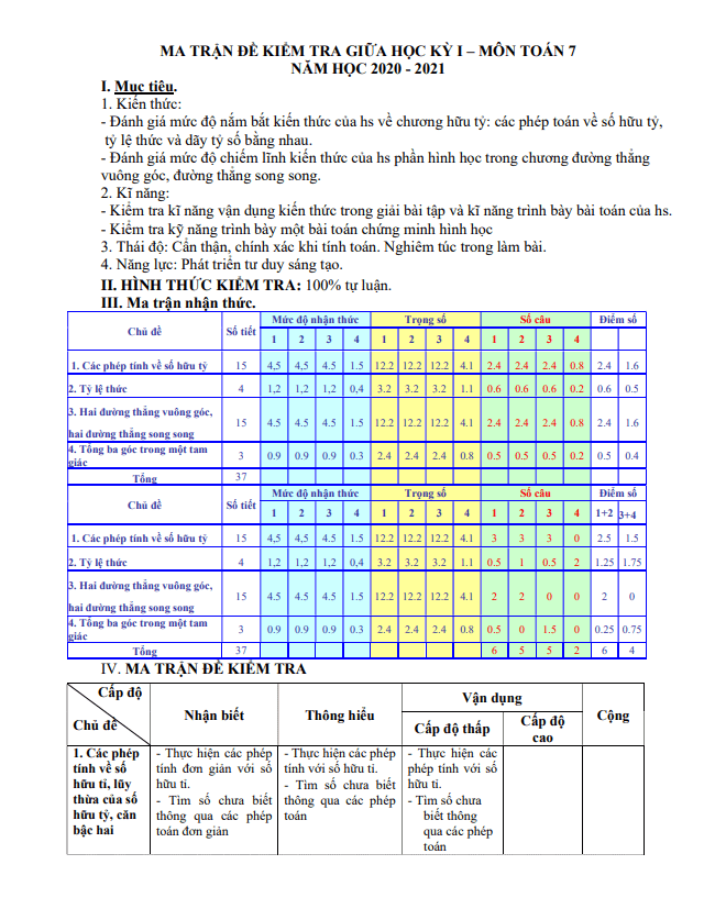 1. Kiến thức: Đánh giá mức độ nắm bắt kiến thức của học sinh về số hữu tỷ, tỷ lệ thức và dãy tỷ số bằng nhau. Đánh giá mức độ chiếm lĩnh kiến thức của học sinh phần hình học trong chương đường thẳng vuông góc, đường thẳng song song.
