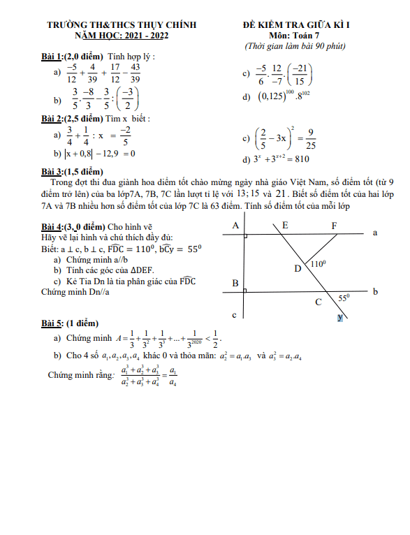 Đề thi Toán giữa kì 1 lớp 7 năm học 2021-2022 trường TH THCS Thụy Chính Thái Bình cung cấp các bài toán đa dạng, giúp học sinh rèn luyện kỹ năng giải quyết vấn đề, logic tư duy và kiến thức Toán học cơ bản.