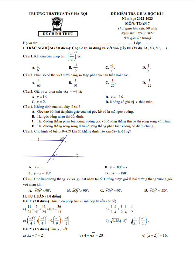 Đề kiểm tra giữa học kì 1 môn Toán lớp 7 năm học 2022 – 2023