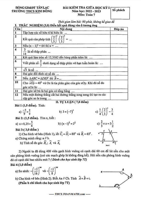 Chào quý thầy cô và các em học sinh lớp 7! Đây là đề kiểm tra giữa học kỳ 1 môn Toán lớp 7 năm học 2022-2023 của trường THCS Kim Đồng, huyện Tân Lạc, tỉnh Hòa Bình. Đề thi này được biên soạn theo cấu trúc 30% trắc nghiệm (dạng toán điền kết quả đúng) và 70% tự luận. Thời gian làm bài thi là 90 phút (không tính thời gian giáo viên coi thi phát đề).
