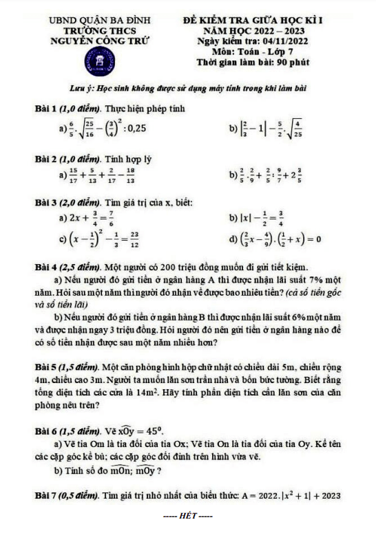 Đề thi giữa học kì 1 môn Toán lớp 7 năm 2022 – 2023 trường THCS Nguyễn Công Trứ Hà Nội