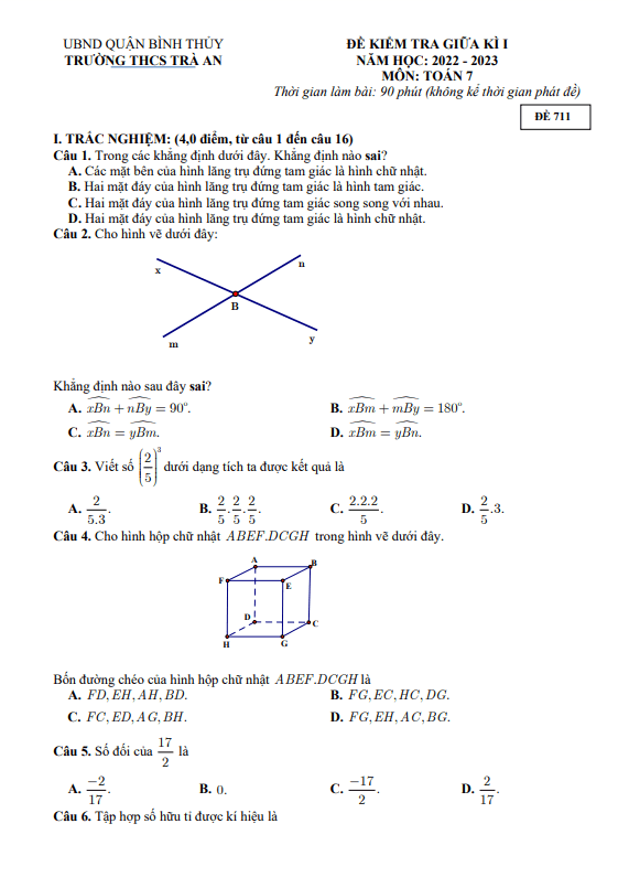 Đề thi giữa học kì 1 (HK1) lớp 7 môn Toán năm 2022 2023 trường THCS Trà An Cần Thơ