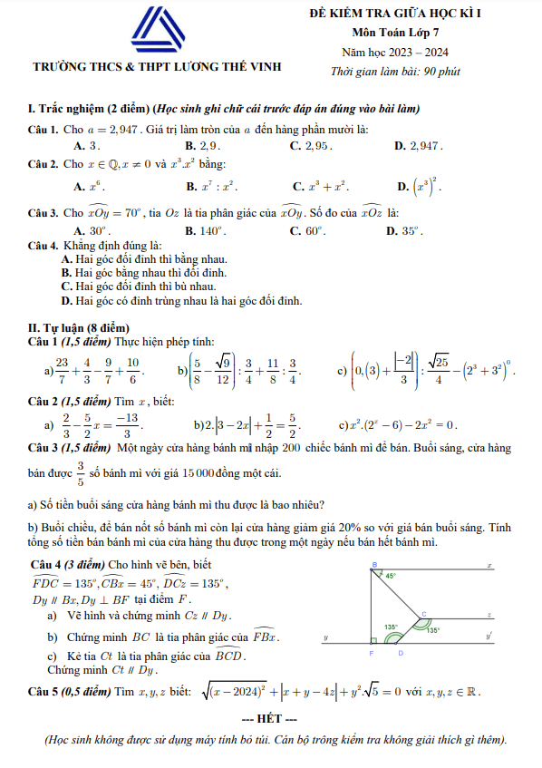 Đề thi giữa học kì 1 (HK1) lớp 7 môn Toán năm 2023 2024 trường Lương Thế Vinh Hà Nội