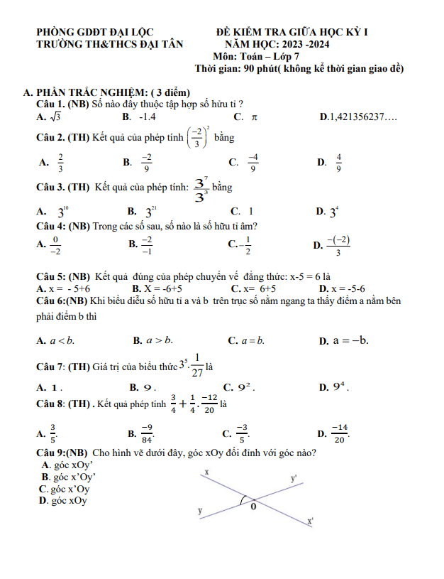 Đề thi giữa học kì 1 (HK1) lớp 7 môn Toán năm 2023 – 2024