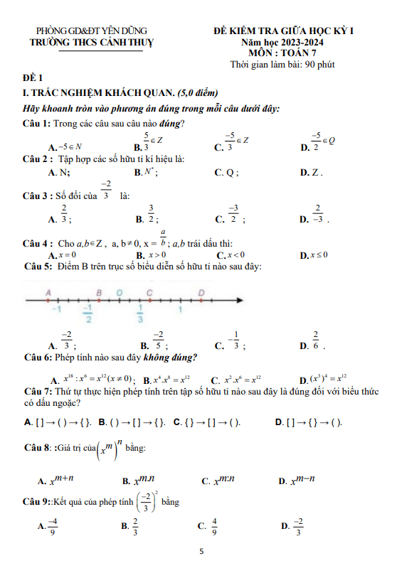 Đề thi giữa học kì 1 (HK1) lớp 7 môn Toán năm 2023-2024 trường THCS Cảnh Thụy Bắc GiangChào đón quý thầy cô và các em học sinh lớp 7! Hôm nay, Sytu xin giới thiệu đến các bạn đề kiểm tra giữa học kỳ 1 môn Toán lớp 7 năm học 2023-2024 tại trường THCS Cảnh Thụy, huyện Yên Dũng, tỉnh Bắc Giang.Đề thi bao gồm 03 trang với cấu trúc 50% câu hỏi trắc nghiệm và 50% câu hỏi tự luận. Thời gian làm bài là 90 phút, đề thi được thiết kế có ma trận, bảng đặc tả, đáp án và hướng dẫn chấm điểm.Dưới đây là một số câu hỏi mẫu trong đề thi:1. Một chiếc trống có bán kính r = 12 cm. Hãy tính diện tích của mặt trống và làm tròn đến hàng phần chục. (Biết π = 3,14 cm)2. Phòng ngủ nhà Long có dạng hình hộp chữ nhật với chiều dài 6m, chiều rộng 4m, chiều cao 2,6m. Tính thể tích của phòng này.3. Sản lượng vải u hồng và vải thiều của nhà Lan năm trước bằng nhau, tổng sản lượng là 12 tấn. Năm nay, sản lượng vải u hồng chỉ bằng 3/4 sản lượng năm trước và bán với giá 20,000 đồng/kg, sản lượng vải thiều gấp 1,5 lần sản lượng năm trước và bán với giá 10,000 đồng/kg. Hỏi Lan có tổng bao nhiêu tấn vải năm nay và số tiền còn lại sau khi trừ chi phí?Đề thi cung cấp cho các em cơ hội thể hiện kiến thức và kỹ năng trong môn Toán. Chúc các em thi tốt! File WORD của đề thi được cung cấp để quý thầy cô tham khảo và sử dụng.