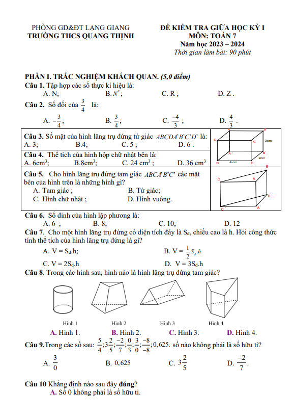 Đề thi giữa học kì 1 (HK1) môn Toán lớp 7 năm 2023-2024 trường THCS Quang Thịnh Bắc Giang