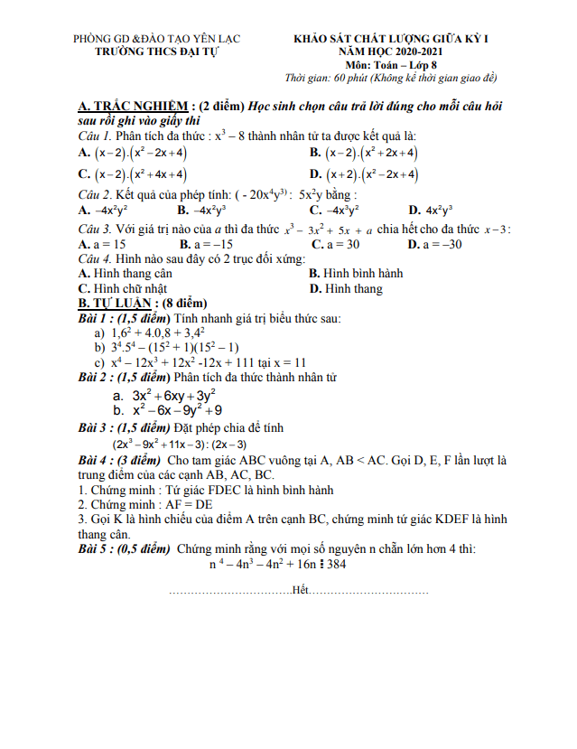 Đề thi Toán giữa học kì 1 lớp 8 năm 2020 – 2021 trường THCS Đại Tự Vĩnh Phúc