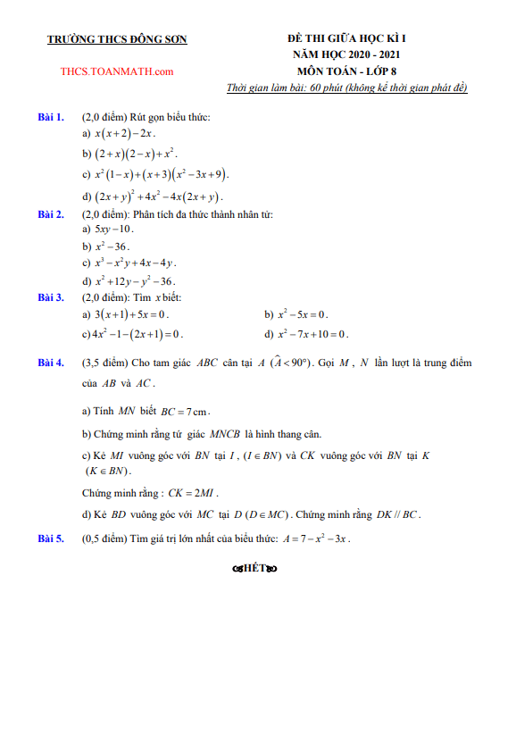 Chào quý thầy cô và các em học sinh lớp 8. Dưới đây là đề thi giữa học kì 1 môn Toán năm học 2020-2021 của trường THCS Đông Sơn Hà Nội, bao gồm đáp án và lời giải chi tiết các bài toán.
