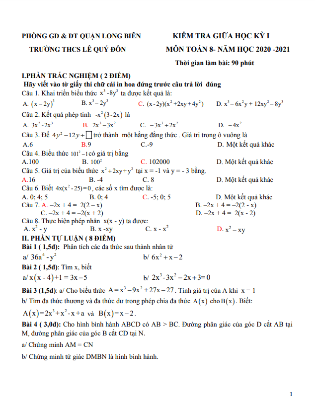 Đề thi giữa học kì 1 Toán lớp 8 năm 2020-2021 trường THCS Lê Quý Đôn – Hà Nội