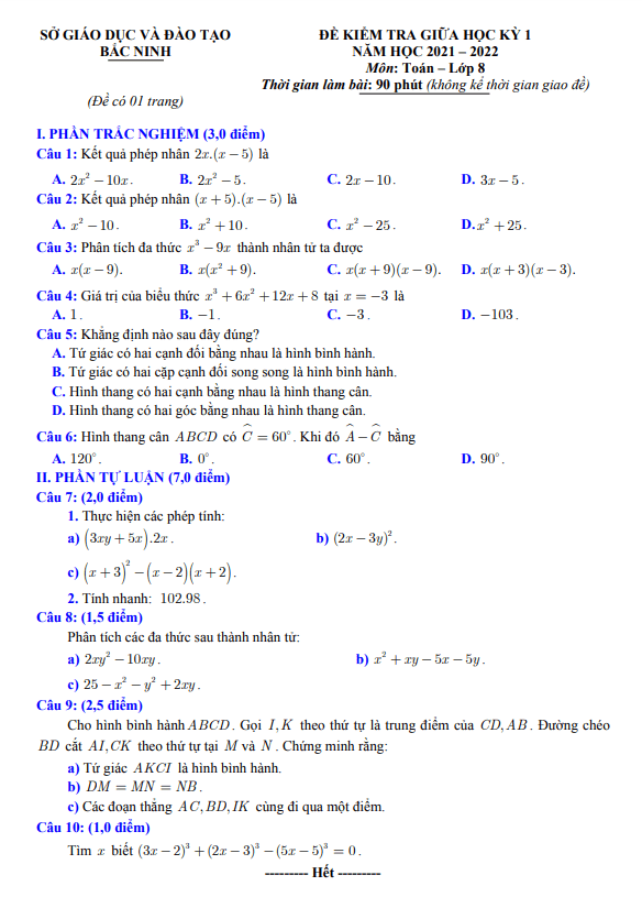 Đề thi giữa học kì 1 Toán lớp 8 năm 2021 – 2022 của sở GD&ĐT Bắc Ninh bao gồm một trang với tổng cộng 11 câu hỏi. Trong đó có 8 câu trắc nghiệm (tương đương 3 điểm) và 3 câu tự luận (tương đương 7 điểm). Thời gian làm bài cho đề thi là 90 phút. Một trong các câu hỏi trắc nghiệm trong đề thi là: “Khẳng định nào sau đây đúng? A. Tứ giác có hai cạnh đối bằng nhau là hình bình hành. B. Tứ giác có hai cặp cạnh đối song song là hình bình hành. C. Hình thang có hai cạnh bằng nhau là hình thang cân. D. Hình thang có hai góc bằng nhau là hình thang cân.” Ngoài ra, đề thi cũng yêu cầu học sinh phải chứng minh một số bài toán như chứng minh tứ giác AKCI là hình bình hành, chứng minh đoạn DM bằng đoạn MN bằng đoạn NB, và chứng minh các đoạn thẳng AC, BD, IK cùng đi qua một điểm. Đề thi còn đưa ra một câu hỏi tự luận khá khó khăn, yêu cầu học sinh phải phân tích đa thức 3x^3 + x^2 – 9 thành nhân tử. Đề thi cũng có đáp án và lời giải chi tiết được cung cấp sau đó để học sinh tham khảo và tự kiểm tra kết quả của mình. Đề thi được thiết kế để kiểm tra kiến thức toán học của học sinh và khuyến khích họ vận dụng kiến thức đã học vào việc giải quyết các bài toán.