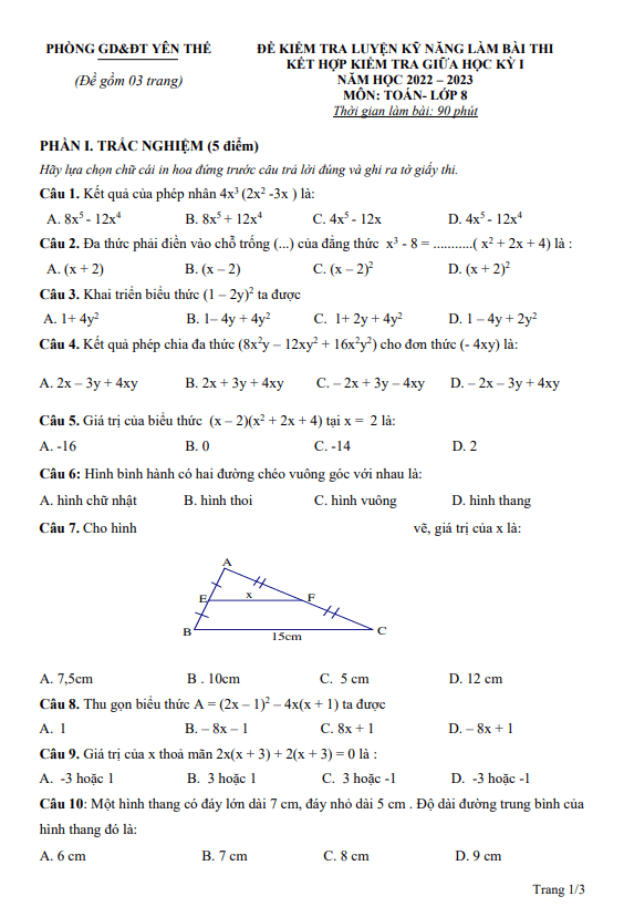 Đề thi giữa học kì 1 (HK1) lớp 8 môn Toán năm 2022 2023 phòng GD ĐT Yên Thế Bắc Giang