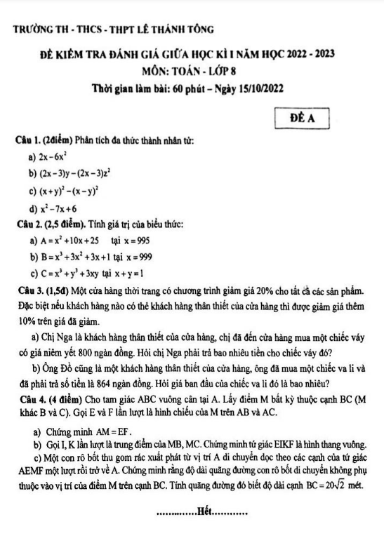 Chào quý thầy cô và các em học sinh lớp 8, dưới đây là đề kiểm tra đánh giá giữa học kì 1 môn Toán năm học 2022 – 2023 của trường TH – THCS – THPT Lê Thánh Tông, thành phố Hồ Chí Minh. Kỳ thi sẽ diễn ra vào ngày 15 tháng 10 năm 2022.