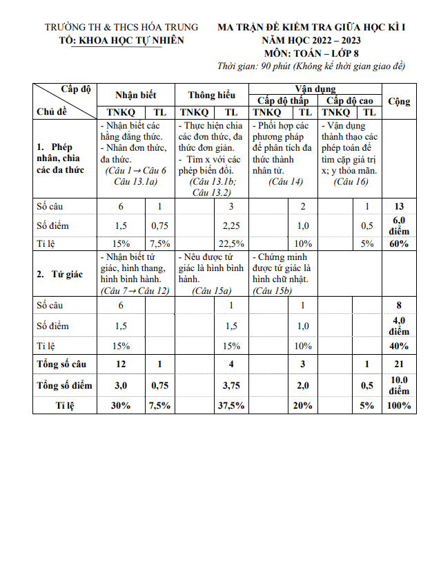 Bài kiểm tra giữa học kỳ 1 môn Toán lớp 8 năm học 2022 – 2023 tại trường TH&THCS Hóa Trung Thái Nguyên là cơ hội để học sinh tự kiểm tra năng lực và kỹ năng của mình trong môn học này. Đề thi được chia thành các phần khác nhau như câu hỏi lựa chọn, tự luận và bài tập thực hành, giúp học sinh phát triển toàn diện về kiến thức và kỹ năng giải quyết vấn đề Toán học.Đề thi bao gồm nhiều dạng câu hỏi khác nhau để đánh giá sâu hơn khả năng hiểu và áp dụng kiến thức của học sinh. Ví dụ, thông qua việc chọn câu sai về tính chất của tứ giác lồi, học sinh cần phải hiểu rõ các định nghĩa và quy tắc cơ bản về tứ giác để chọn ra câu trả lời đúng. Ngoài ra, việc chứng minh tính chất của tứ giác MNPQ và điều kiện để hình chữ nhật cũng đòi hỏi học sinh phải kết hợp kiến thức và logic để giải quyết vấn đề.Đề thi cũng đưa ra các câu hỏi về tính chất của hình thang, khuyến khích học sinh phải suy luận và tìm hiểu sâu hơn về các hình học căn bản. Những câu hỏi như “Nếu một hình thang có hai cạnh đáy bằng nhau thì hai cạnh bên bằng nhau, hai cạnh bên song song” không chỉ là kiến thức mà còn là cơ hội giúp học sinh rèn luyện kỹ năng suy luận và chứng minh.Trên tất cả, bài kiểm tra giữa học kỳ 1 môn Toán lớp 8 tại trường TH&THCS Hóa Trung Thái Nguyên không chỉ là cơ hội để học sinh tự đánh giá năng lực của mình mà còn là dịp để rèn luyện kỹ năng giải quyết vấn đề và logic thông qua việc áp dụng kiến thức học được vào thực tế. Qua đó giúp học sinh phát triển một cách toàn diện về kiến thức và kỹ năng Toán học.