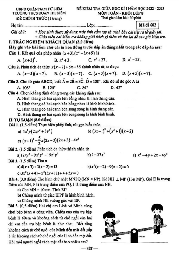 Trích dẫn một số câu hỏi từ đề giữa học kì 1 Toán lớp 8 năm 2022 – 2023 trường THCS Đoàn Thị Điểm Hà Nội: